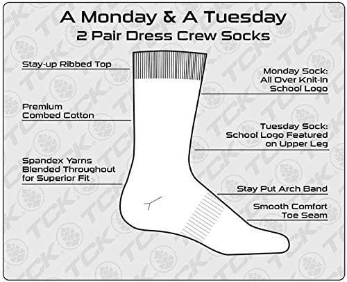 Feel the difference in soft combed cotton while sporting your school pride. The TCK University Collection of Monday-Tuesday fine gauge cotton dress crew socks add just the right amount of pep to your work day wardrobe. This is it! Ideal for gifts, Christmas, Valentine’s Day, Birthday, Mother’s & Father’s Day, Back to School, Football Games, and more.