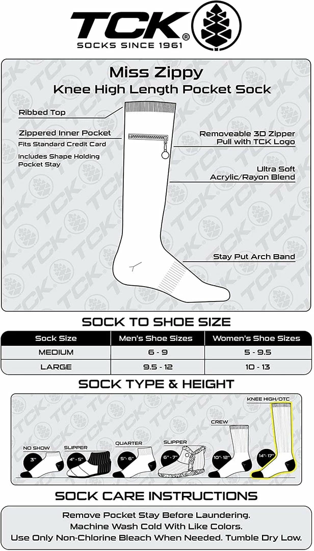 TCK Miss Zippy – High performance knee high socks with a pocket. Brilliant. Stash away secret goodies with a secure zip pocket within the sock leg. These socks are great for travel and events. Each pair comes with 1 pocket sock and 1 basic high performance sock. With zoned cushioning, stay put compression arch band, mesh upper panels, and dry IQ wicking, your feet will say Thank You. Designed for performance, style, & comfort. Made of 96% Polyester, 3% Rubber, 1% Spandex.