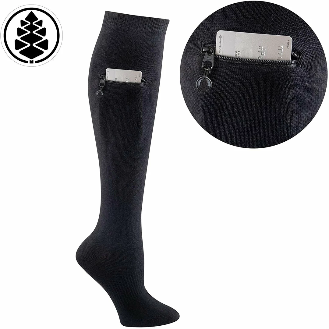 - POCKET KNEE HIGH SOCKS: Each pair of over the calf TCK zipper socks come with 1 pocket sock and 1 regular sock! Zippered inner pocket is perfect for keeping small stashes safe, including cash, credit cards, keys, golf tees, ID, hotel key, lip balm, and other items. The zipper pocket does not hold a cell phone.