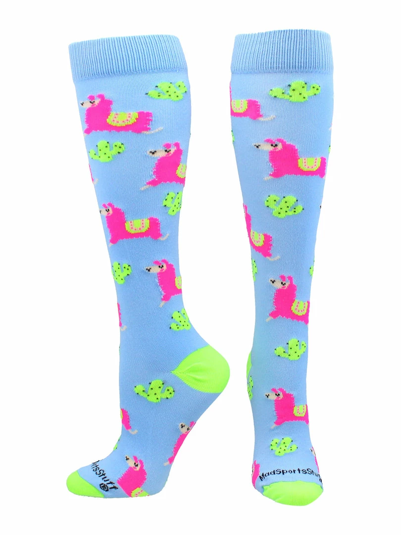 - PERFECT LLAMA SOCKS: Although these socks have the performance yarns to be worn on the field or court, they are also attention grabbing fashion socks! These Cactus and Llama Socks socks feature bright and colorful llamas with surrounding cacti. Great for the fashionista or for sports such as softball, field hockey, soccer, volleyball, lacrosse, basketball, t-ball and more!!