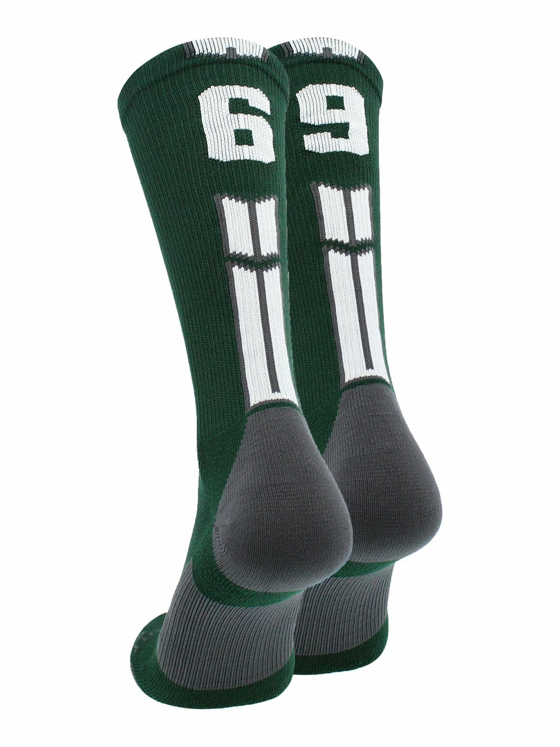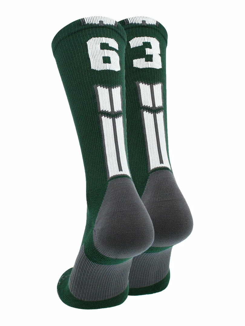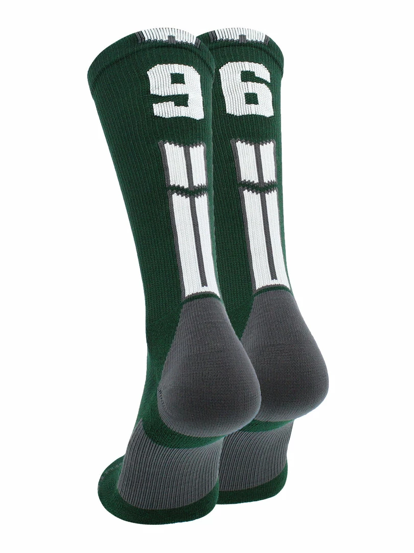 NUMBER SOCKS SOLD AS A PAIR!! MadSportsStuff Player Id Jersey Number Socks Crew Length Dark Green and White. Select your own personalized jersey number. High performance athletic number socks for all team sports and elite athletes. These jersey number socks are ideal for boys and girls and are great for basketball, football, volleyball, lacrosse and more!