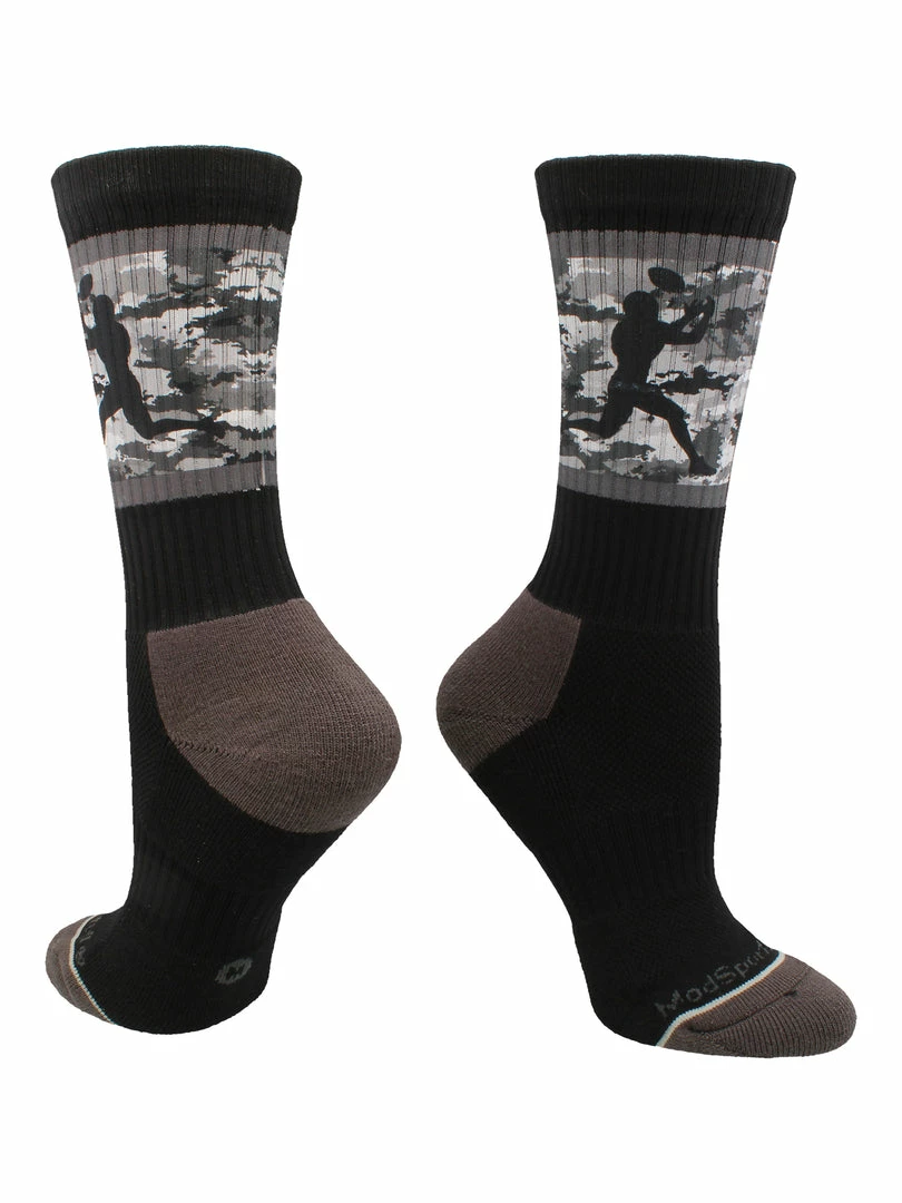 - PERFECT FOOTBALL SOCKS: This crew sock featuring a football player silhouette on a camo background is sure to be a hit with your favorite football or flag football enthusiast!