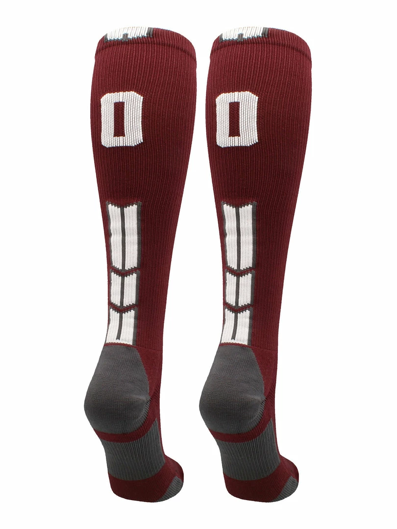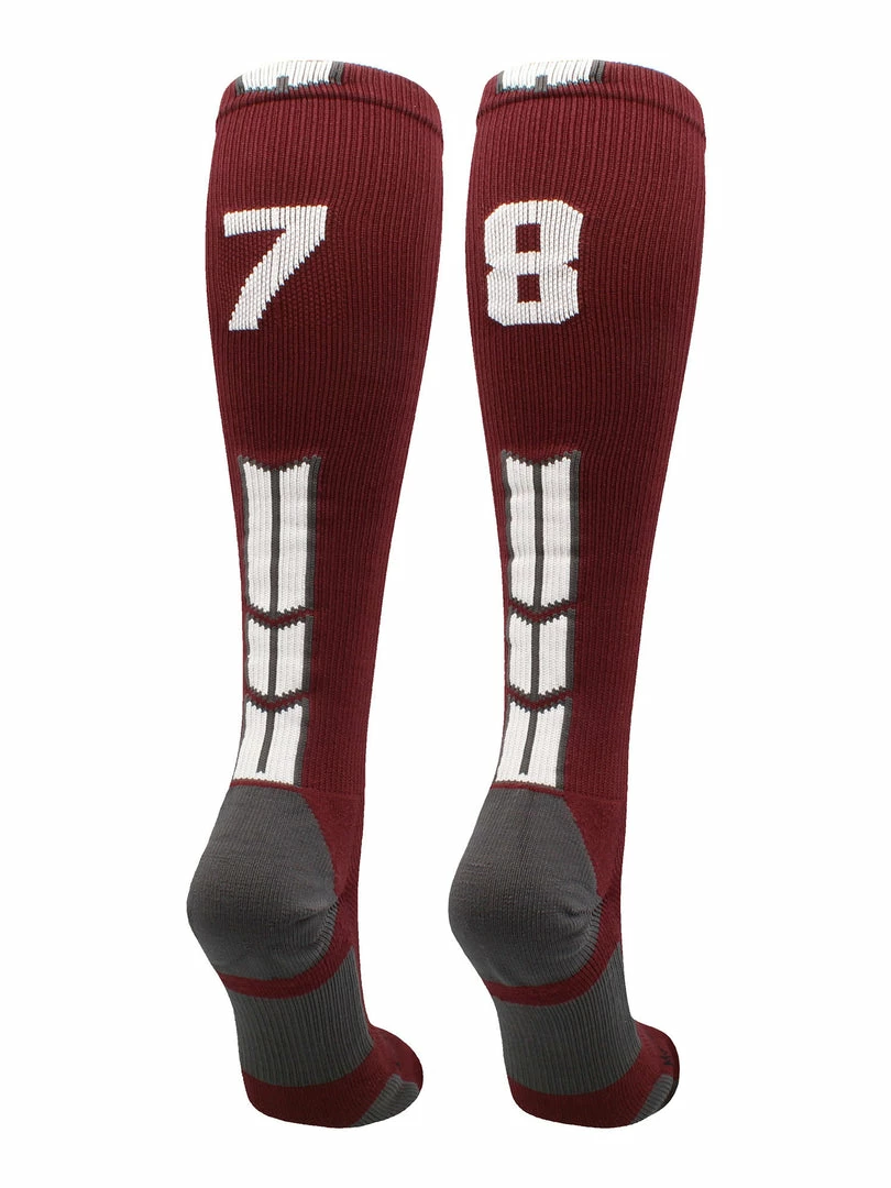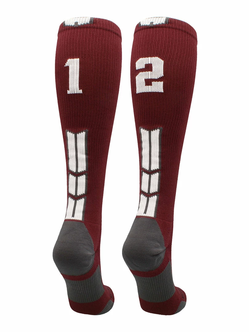 NUMBER SOCKS SOLD AS A PAIR!! MadSportsStuff Player Id Jersey Number Socks Over the Calf Length Maroon and White. Select your own personalized jersey number. High performance athletic number socks for all team sports and elite athletes. These jersey number socks are ideal for boys and girls and are great for soccer, football, baseball, softball, basketball, volleyball, lacrosse and more!