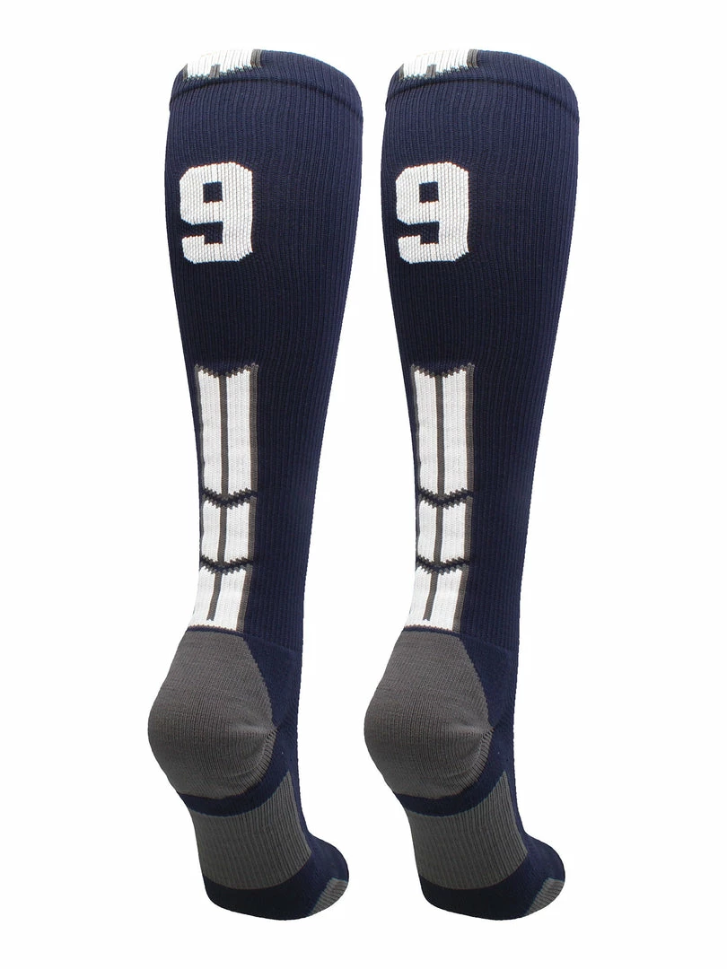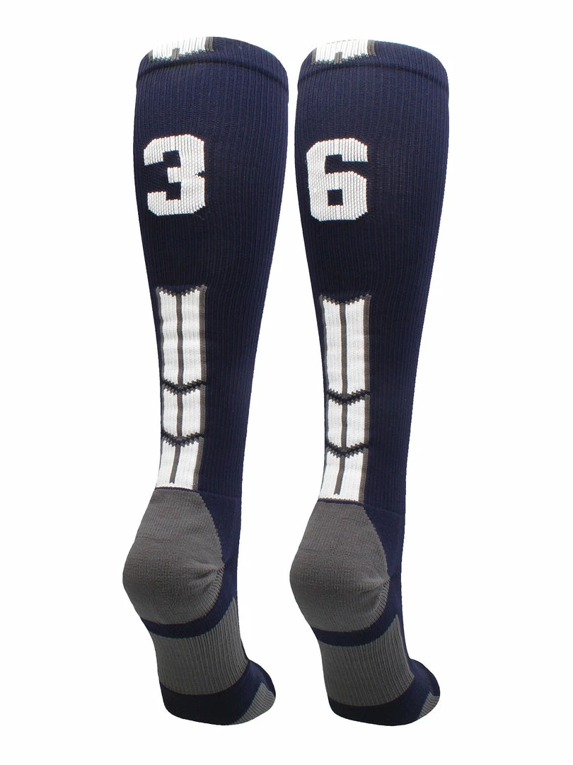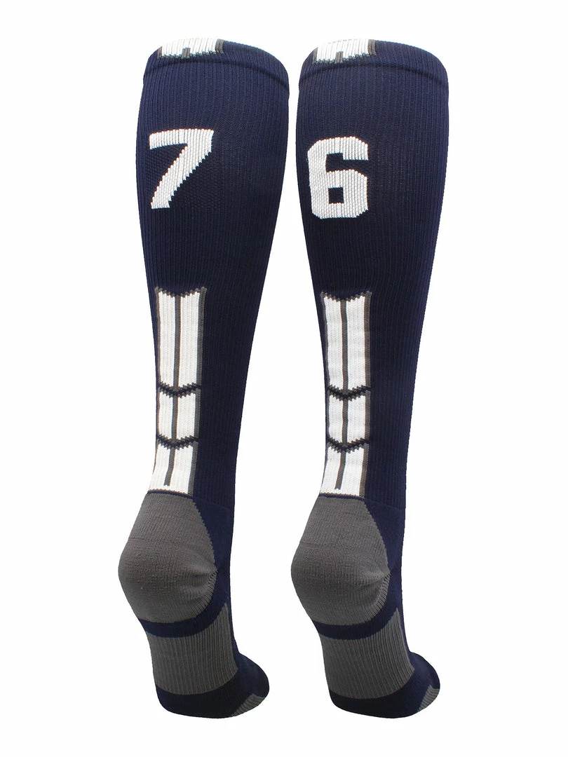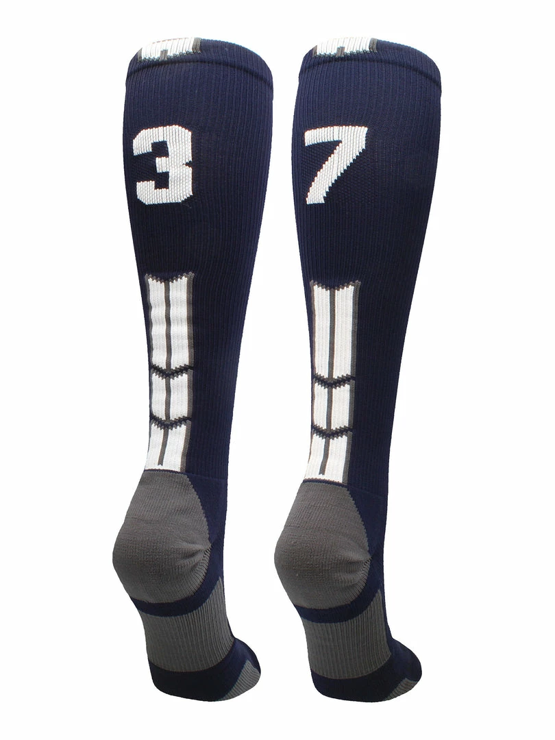 NUMBER SOCKS SOLD AS A PAIR!! MadSportsStuff Player Id Jersey Number Socks Over the Calf Length Navy and White. Select your own personalized jersey number. High performance athletic number socks for all team sports and elite athletes. These jersey number socks are ideal for boys and girls and are great for soccer, football, baseball, softball, basketball, volleyball, lacrosse and more!