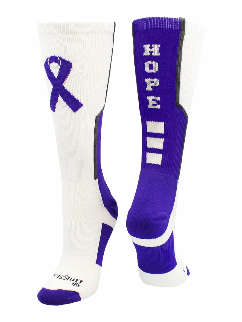 - PERFECT SPORTS AWARENESS SOCKS: Made with the athlete in mind. Show your support with these Hope Cancer Crew socks featuring a purple ribbon. Great for Relay for life events, Pancreatic Cancer awareness, football, basketball, lacrosse, volleyball, wrestling and more!