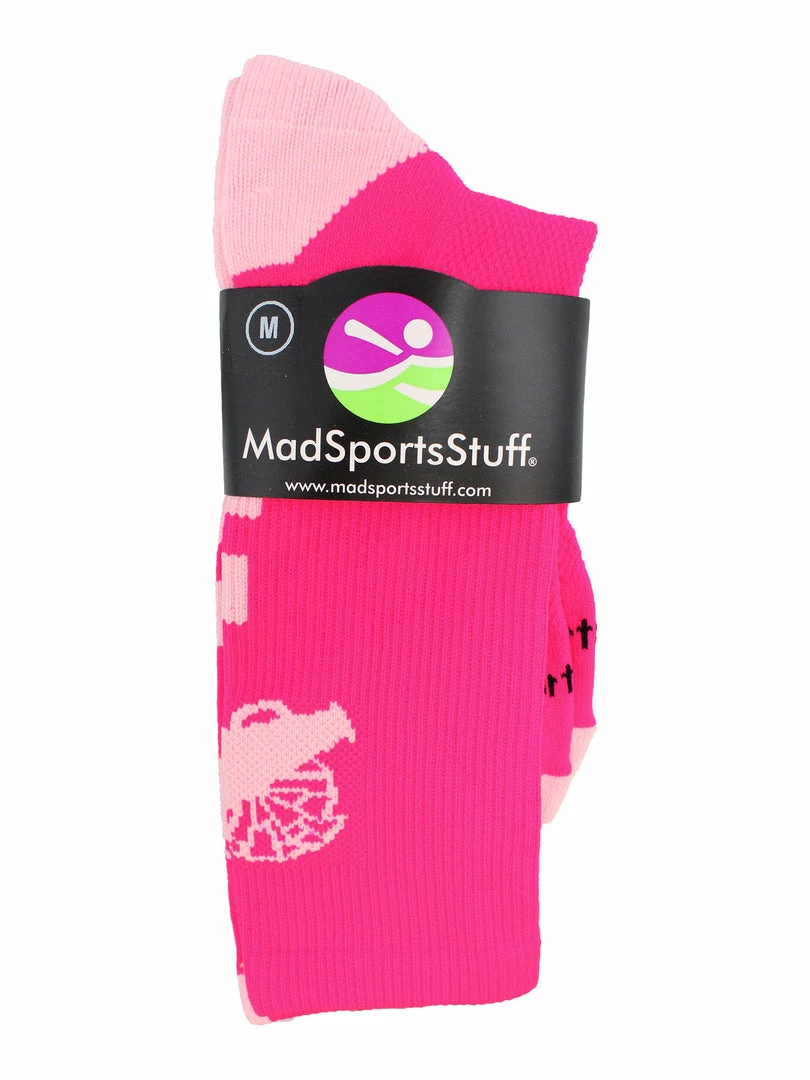MadSportsStuff Breast Cancer Awareness Cheer Socks in a crew length. High performance athletic socks for all Cheer or Poms teams. These socks feature a Pom and Pom and a Megaphone that features a Pink Ribbon for Breast Cancer Awareness.