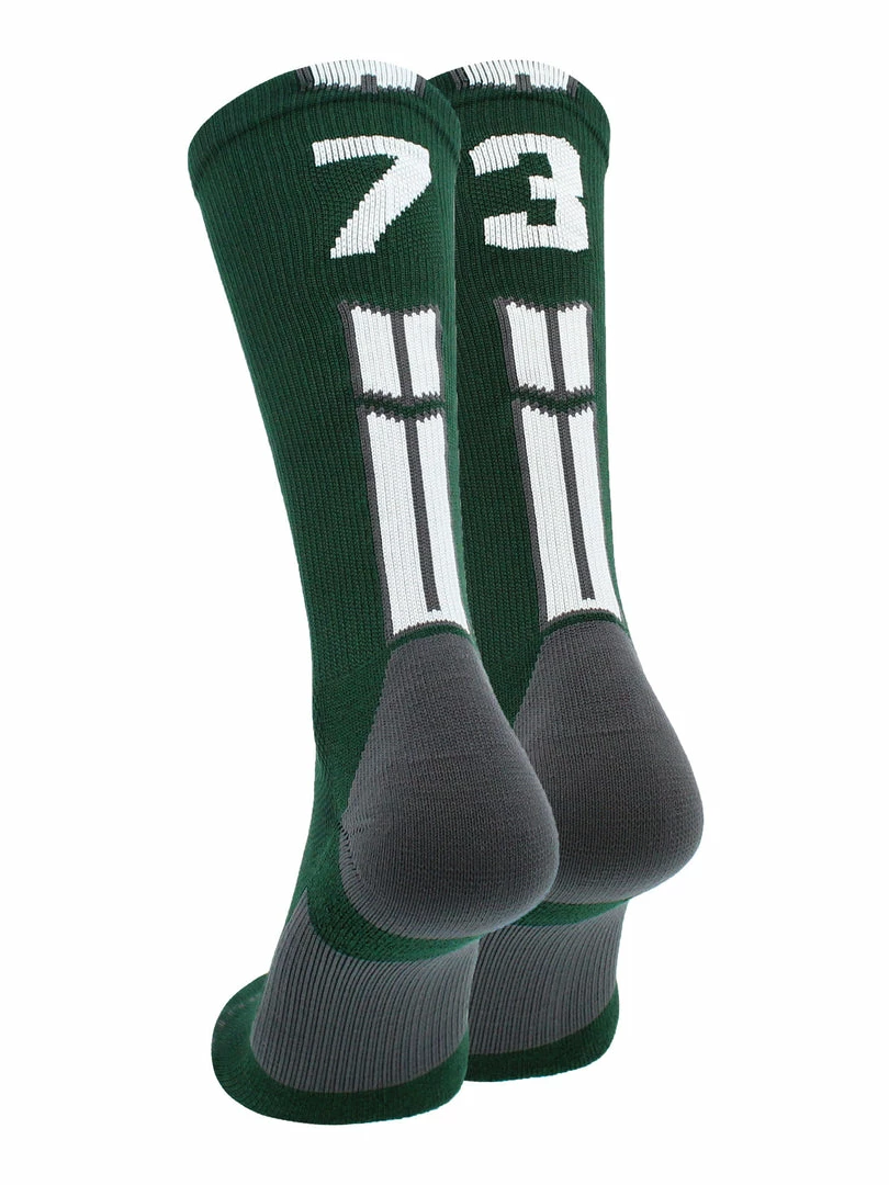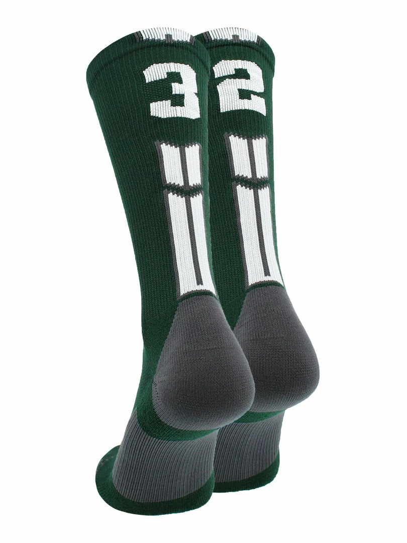 NUMBER SOCKS SOLD AS A PAIR!! MadSportsStuff Player Id Jersey Number Socks Crew Length Dark Green and White. Select your own personalized jersey number. High performance athletic number socks for all team sports and elite athletes. These jersey number socks are ideal for boys and girls and are great for basketball, football, volleyball, lacrosse and more!