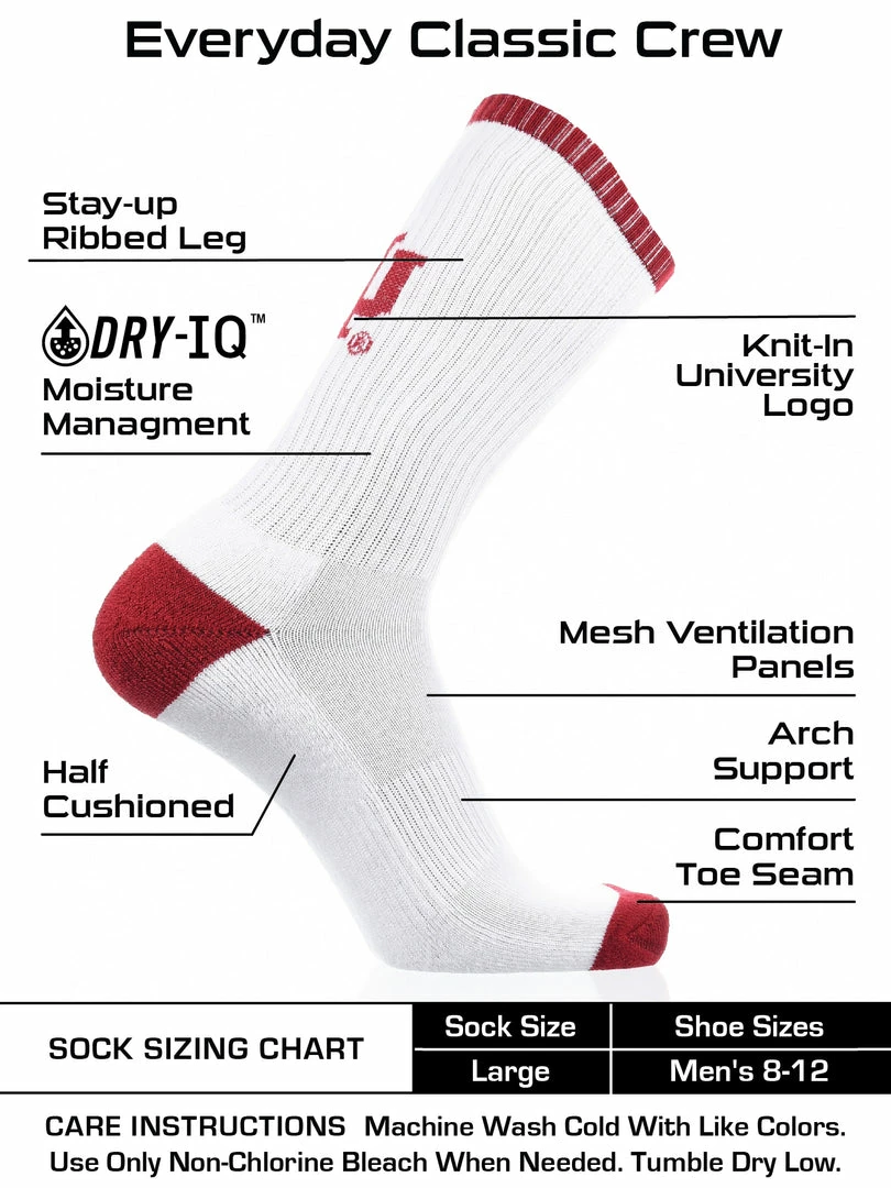 The Basic Crew White Socks offer timeless design, superior comfort all while showing your school pride. Perfect with sneakers and slides or even lace-ups and loafers, these socks bring versatility to your wardrobe no matter what the occasion. These high quality Indiana University Hoosier socks are an ideal gift for Father’s Day, birthdays, stocking stuffers or going back to school. TCK Basic Crew White Socks are made up of 94% Polyester, 4% Rubber, 2% Spandex.