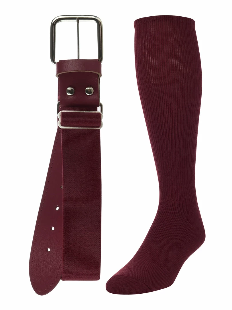 - BASEBALL SOCK/BELT COMBO SET: Our Baseball or Softball Sock/Belt combo includes 1 pair of solid colored athletic over the calf socks, and a perfectly coordinating elastic belt that is that can be easily adjusted to accommodate most waistlines.