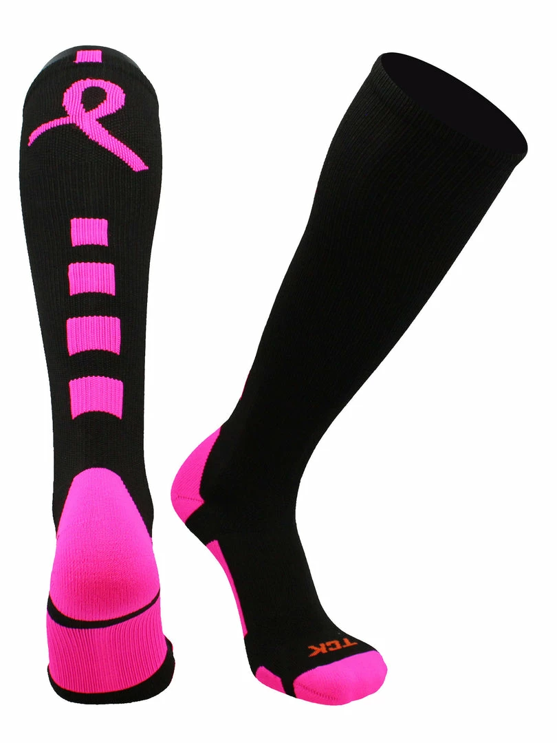- HIGH PERFORMANCE AWARENESS SOCKS: Support Breast Cancer Awareness with these athletic over the calf socks. These socks hit just below the knee and feature a Pink Ribbon on the back. These socks are great for boys or girls and are ideal for football, baseball, softball, basketball, volleyball, cheer, wrestling, lacrosse, flag football and more!