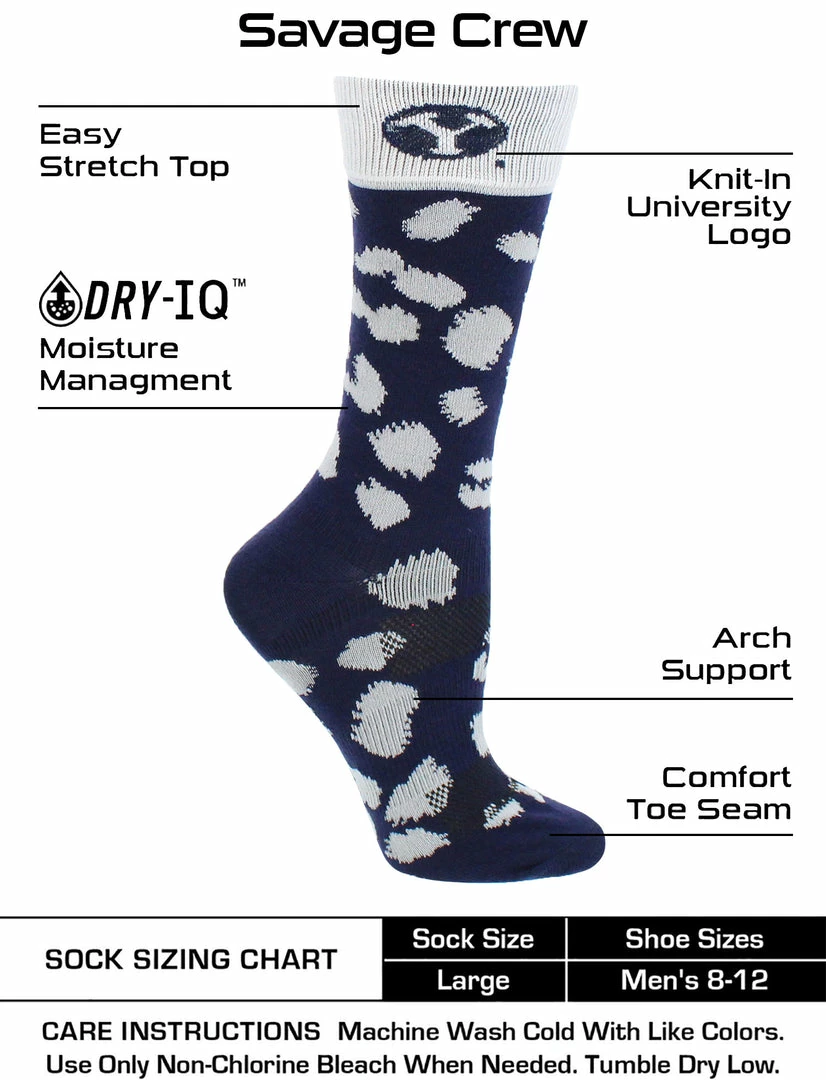 - COMFORT AND BREATHABILITY: These premium quality Brigham Young Cougars leopard print casual socks provide soft comfort. Moisture management technology pulls moisture and sweat away from skin.