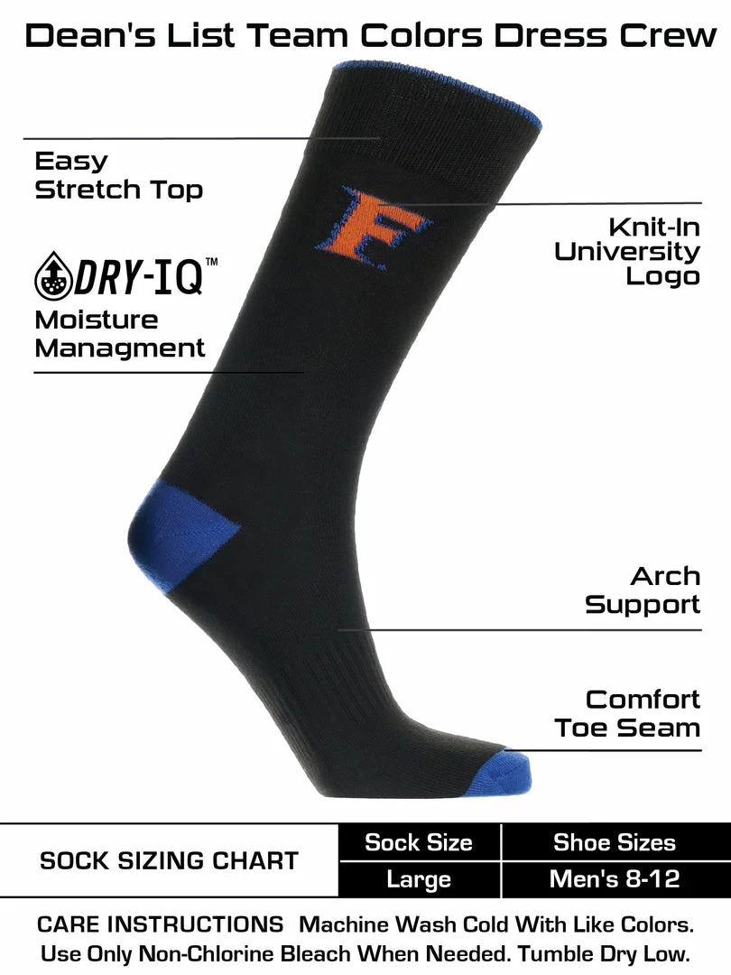 TCK Dean’s List crew length dress socks feature a smooth flat-knit fabric and classic team color styling. Perfect for lace-ups or loafers, these socks let you maintain a professional look while you support your school. Offering softness, comfort, and durability these high quality University of Florida Gators socks are an ideal gift for Father’s Day, birthdays, stocking stuffers or going back to school. Made up of 97% Polyester, 3% Spandex. Go Gators!