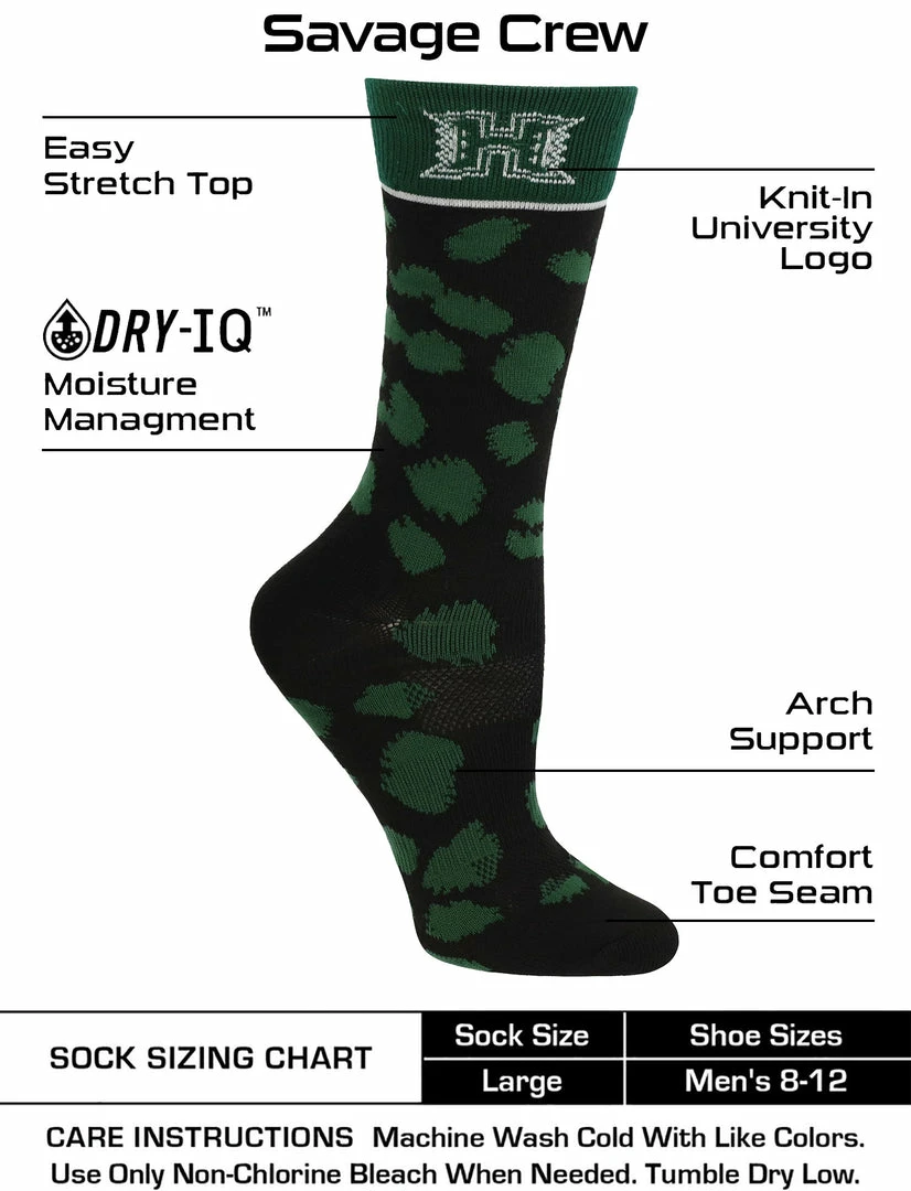 Show your school spirit in the office, at a wedding, at the football stadium or basketball game. Soft and durable, these socks let you maintain a professional look while you support your school. Offering comfort, breathability, performance, and durability these high quality University of Hawaii Rainbow Warriors socks are an ideal gift for birthdays, stocking stuffers, Mother’s Day or going back to school. TCK Womens Savage Socks are made up of 97% Polyester, 3% Spandex. Go Rainbow Warriors!