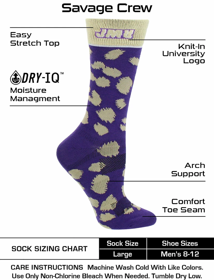 Show your school spirit in the office, at a wedding, at the football stadium or basketball game. Soft and durable, these socks let you maintain a professional look while you support your school. Offering comfort, breathability, performance, and durability these high quality James Madison University Dukes socks are an ideal gift for birthdays, stocking stuffers, Mother’s Day or going back to school. TCK Womens Savage Socks are made up of 97% Polyester, 3% Spandex. Go Dukes!