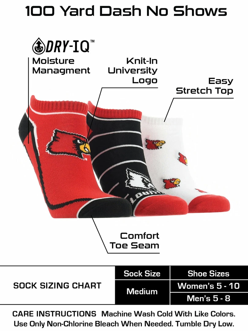 TCK Full Field, No Show Socks come with 3 pairs of comfy socks. Get ready to cheer on your favorite team during the season! Wear these to the tailgate party, working out, or lounge around the house.Offering comfort, breathability, and durability these high quality University of Louisville Cardinals socks are an ideal gift for birthdays, stocking stuffers or going back to school. Made of 97% Polyester, 3% Spandex. Gear up for the big game! Go Cards!