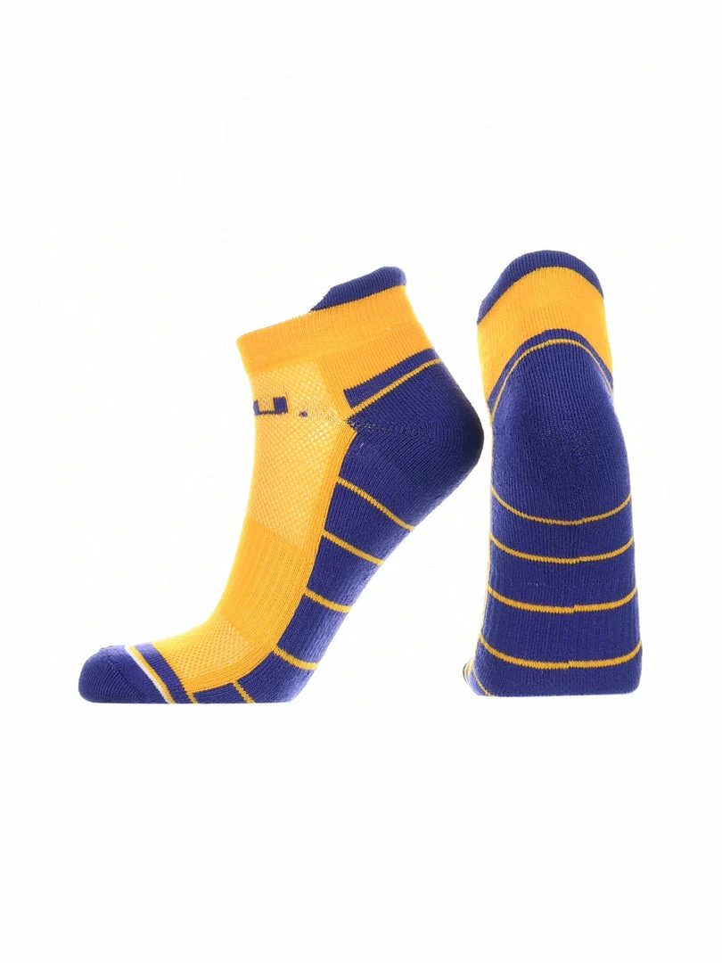 - COMFORT AND BREATHABILITY: These premium quality LSU socks have a cushioned foot for all day comfort. Mesh panel ventillation above the foot allows for proper air flow. Moisture management technology pulls away moisture from skin, keeping your feet cool and dry.