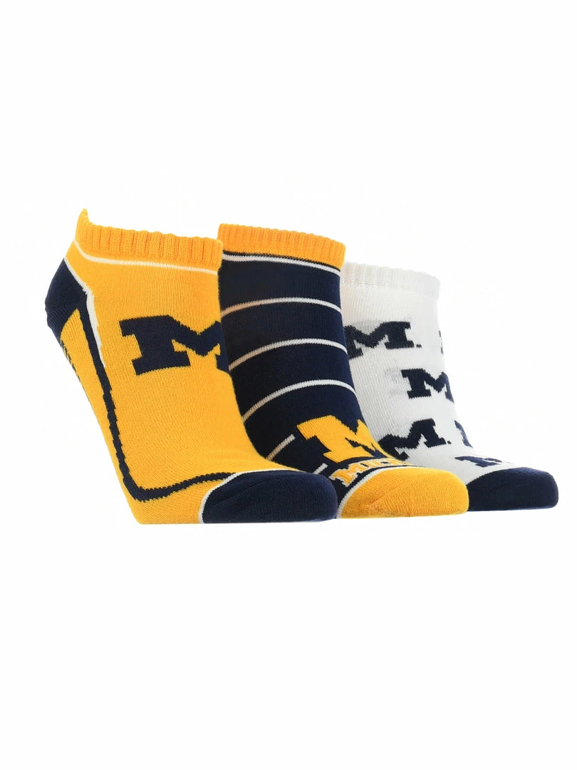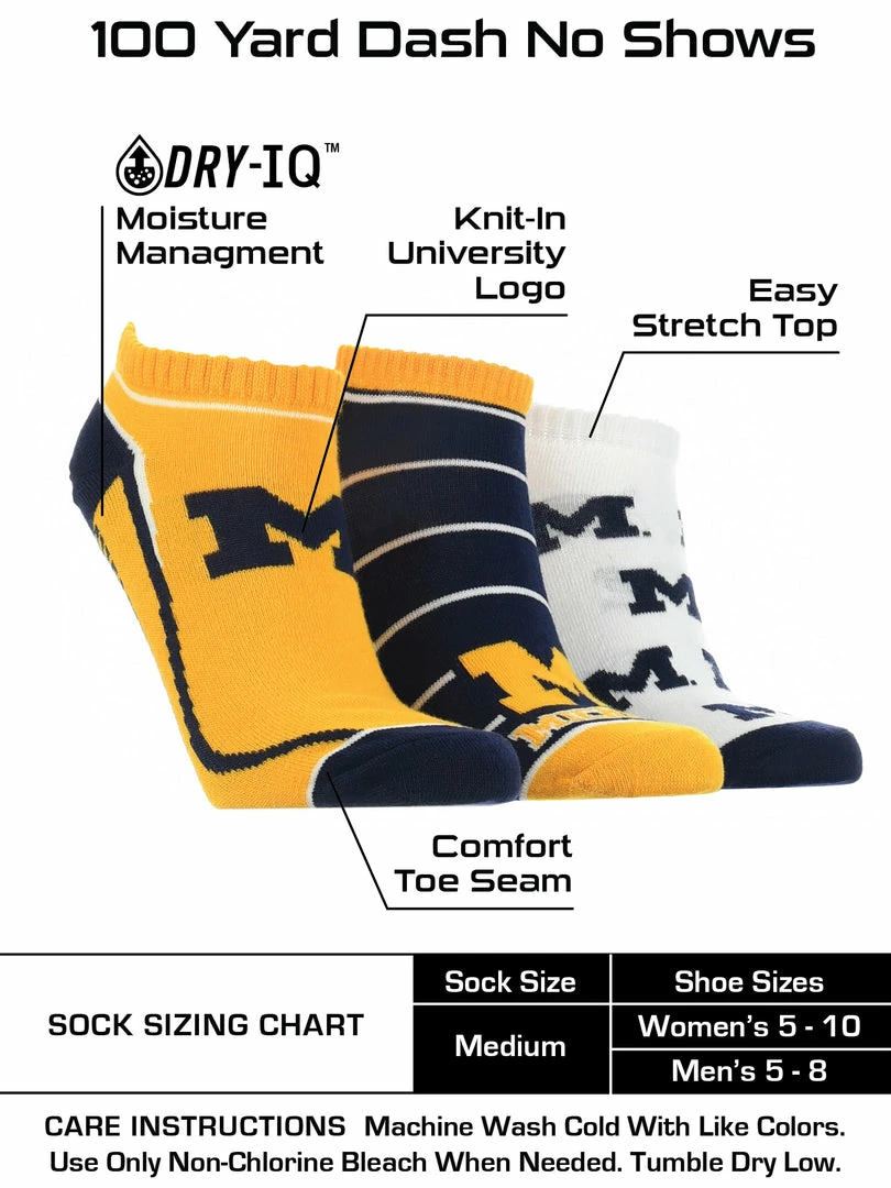 TCK Full Field, No Show Socks come with 3 pairs of comfy socks. Get ready to cheer on your favorite team during the season! Wear these to the tailgate party, working out, or lounge around the house.Offering comfort, breathability, and durability these high quality University of Michigan Wolverines socks are an ideal gift for birthdays, stocking stuffers or going back to school. Made of 97% Polyester, 3% Spandex. Gear up for the big game! Maize & Blue!