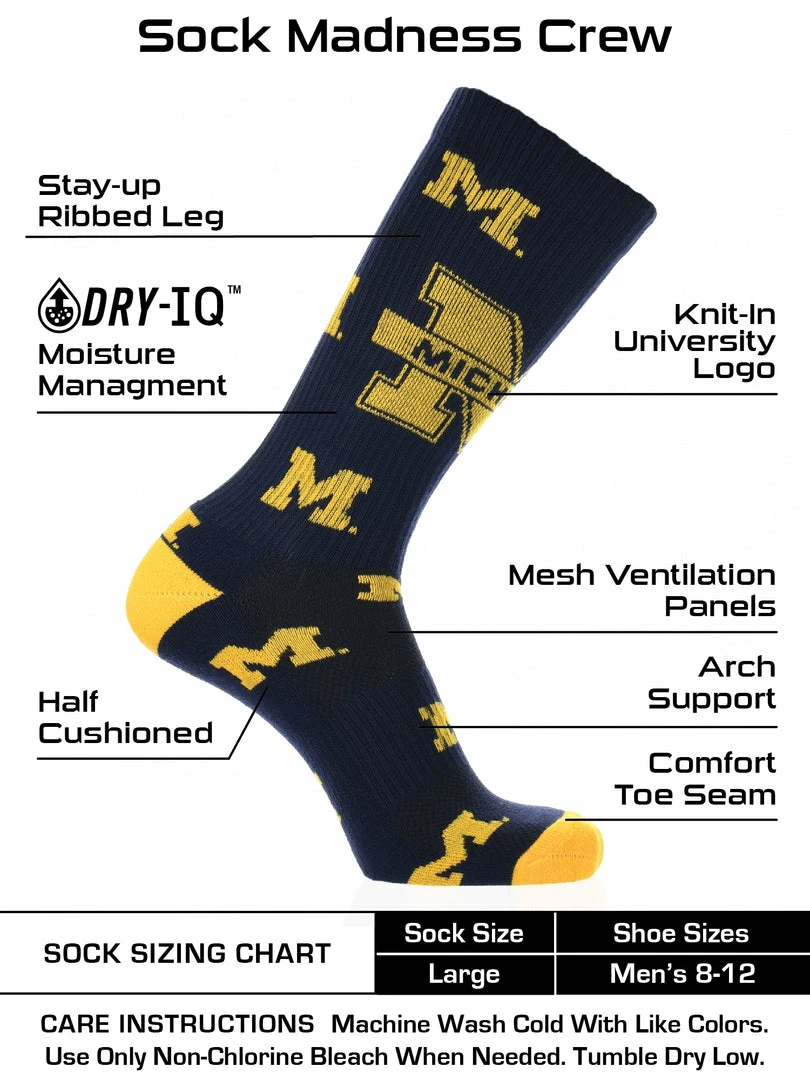 - COMFORT AND BREATHABILITY: These premium quality Michigan Socks provide soft comfort. Mesh panel ventillation above the foot allows for proper air flow. Keeping the feet dry. Moisture management technology pulls away moisture from skin.