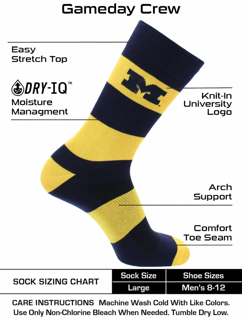 Show your school spirit in the office, at a wedding, at the football stadium or basketball game. Soft and durable, these socks let you maintain a professional look while you support your school. Offering comfort, breathability, performance, and durability these high quality University of Michigan Wolverines socks are an ideal gift for Father’s Day, birthdays, stocking stuffers or going back to school. TCK Game Day Striped Socks are made up of 97% Polyester, 3% Spandex. Go Blue!