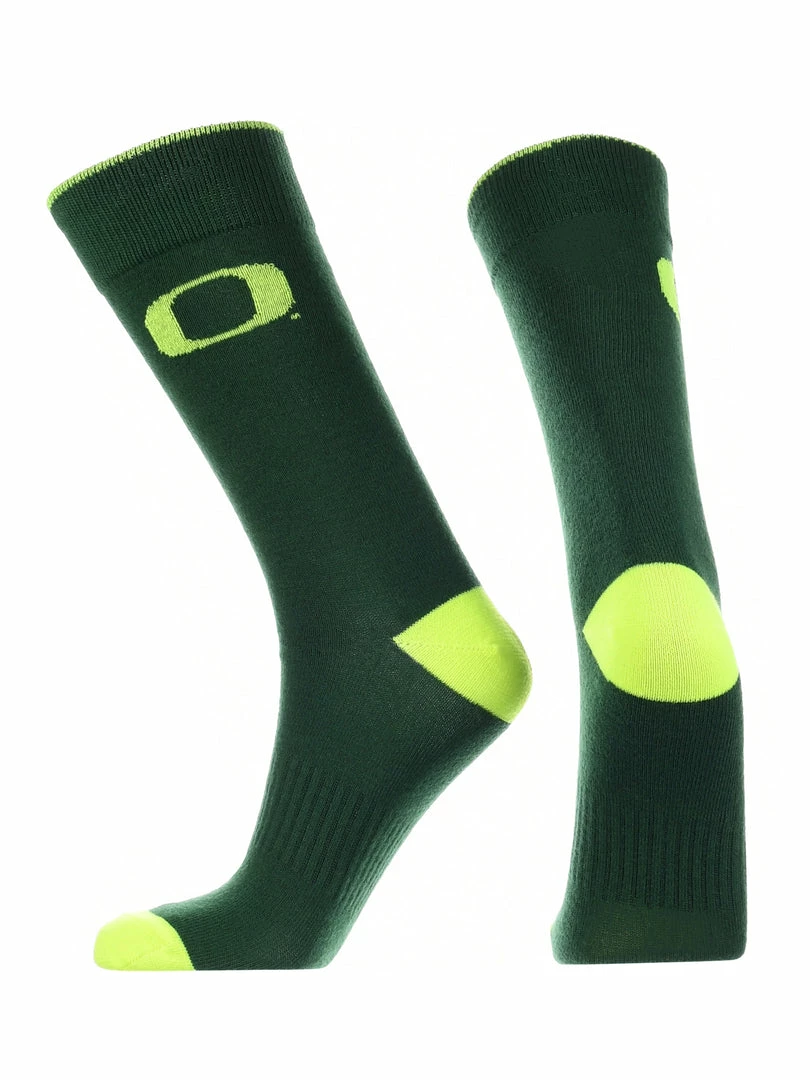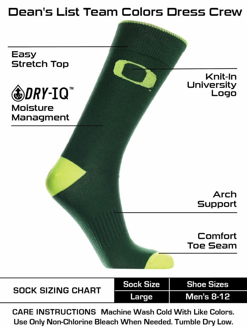 TCK Dean’s List crew length dress socks feature a smooth flat-knit fabric and classic team color styling. Perfect for lace-ups or loafers, these socks let you maintain a professional look while you support your school. Offering softness, comfort, and durability these high quality University of Oregon Ducks socks are an ideal gift for Father’s Day, birthdays, stocking stuffers or going back to school. Made up of 97% Polyester, 3% Spandex. Go Ducks!