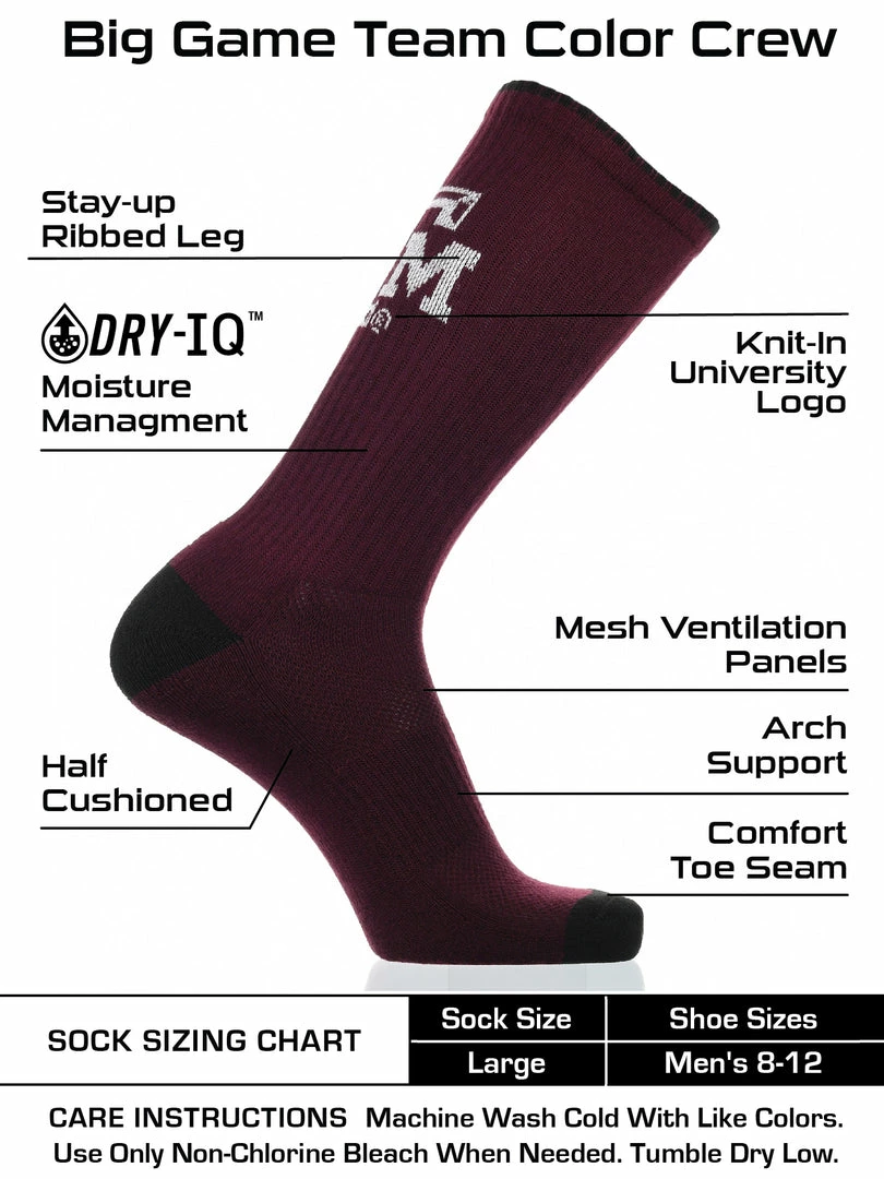 - COMFORT AND BREATHABILITY: These premium quality Texas A&M socks provide soft comfort. Mesh panel ventillation above the foot allows for proper air flow. Moisture management technology pulls away moisture from skin, keeping your feet cool and dry.