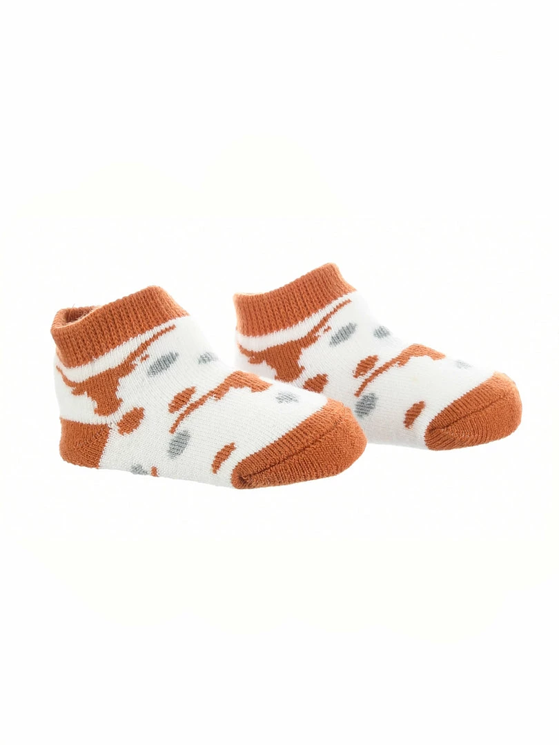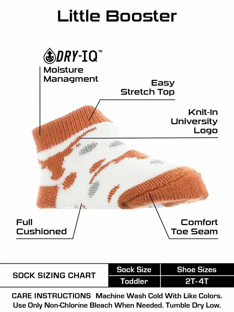 TCK Little Fan Low Cut Toddler Socks are soft and comfy. Get the little ones ready for gameday. If you are headed to the tailgate, game or cheering on the team from home, show off the school spirit! Offering an easy stretch top, soft comfortbale feel, and durability these high quality University of Texas Longhorns socks are an ideal gift for birthdays, stocking stuffers or baby showers. Toddler Size 2T-4T. Made of 98% Polyester, 2% Spandex. Hook Em Horns!