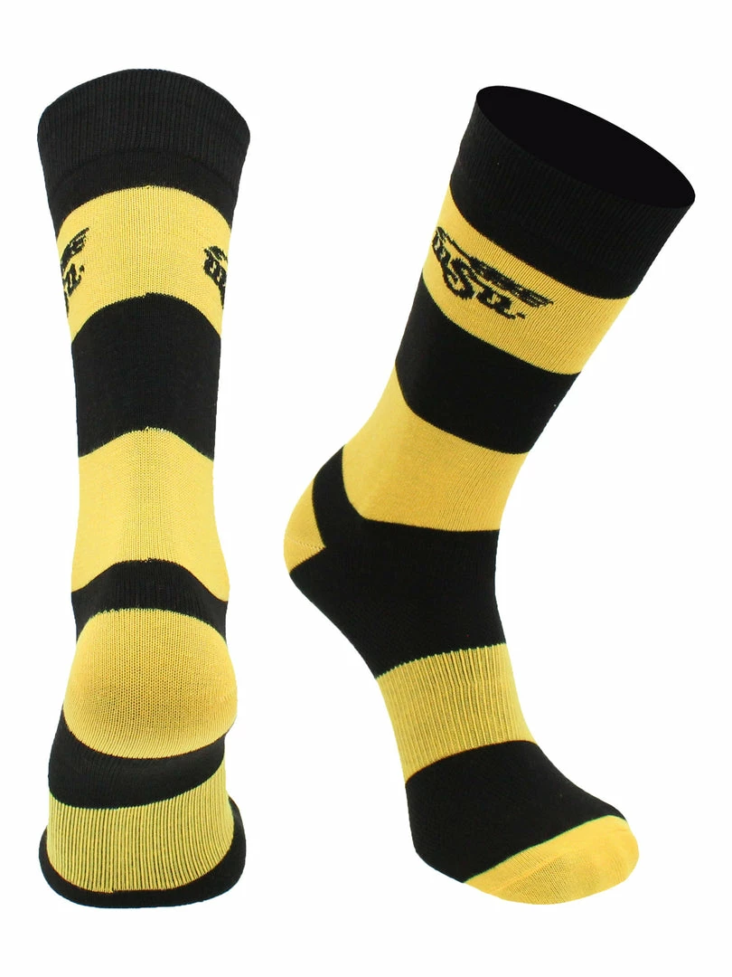 Show your school spirit in the office, at a wedding, at the football stadium or basketball game. Soft and durable, these socks let you maintain a professional look while you support your school. Offering comfort, breathability, performance, and durability these high quality Wichita State University Shockers socks are an ideal gift for Father’s Day, birthdays, stocking stuffers or going back to school. TCK Game Day Striped Socks are made up of 97% Polyester, 3% Spandex. We Are!