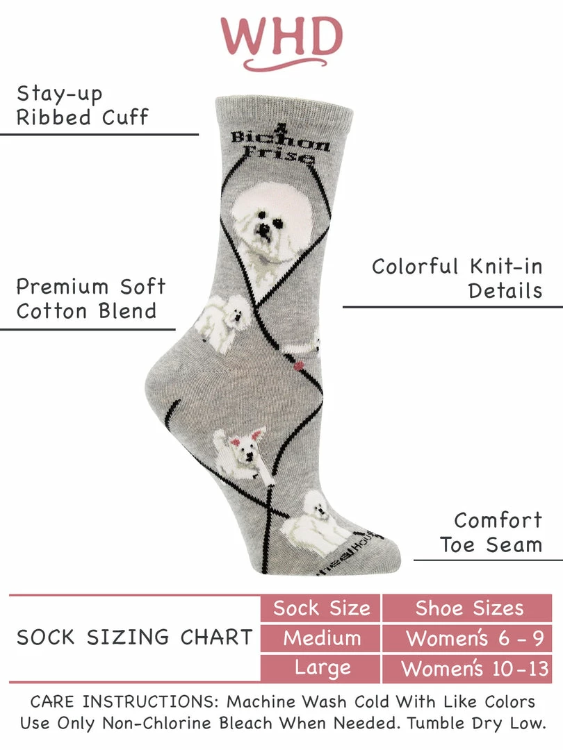 WHD Dog Lovers Socks are made up of 65% Cotton, 20% Nylon, 12% Polyester, and 3% Spandex.