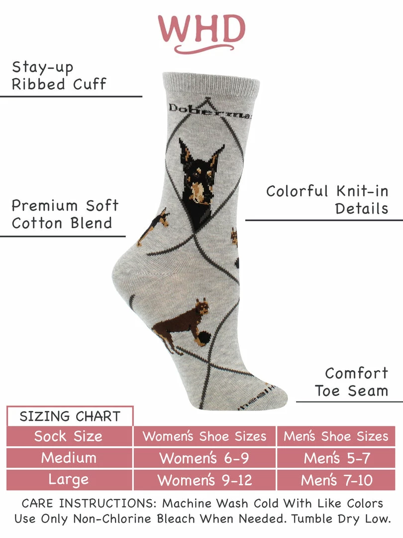- PERFECT FOR DOG LOVERS – Incredibly intelligent and observant, the Doberman Pinscher will ensure that everything is in order and everyone is in their place! Your feet will find their home inside the adorable Doberman Pinscher crew sock.